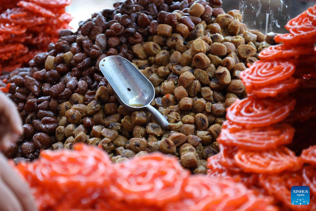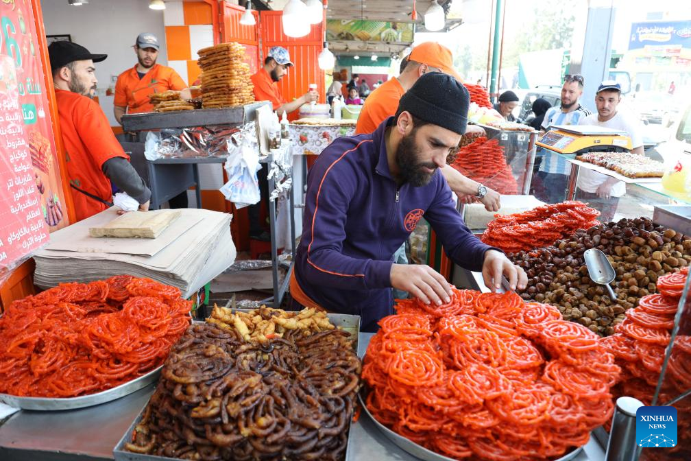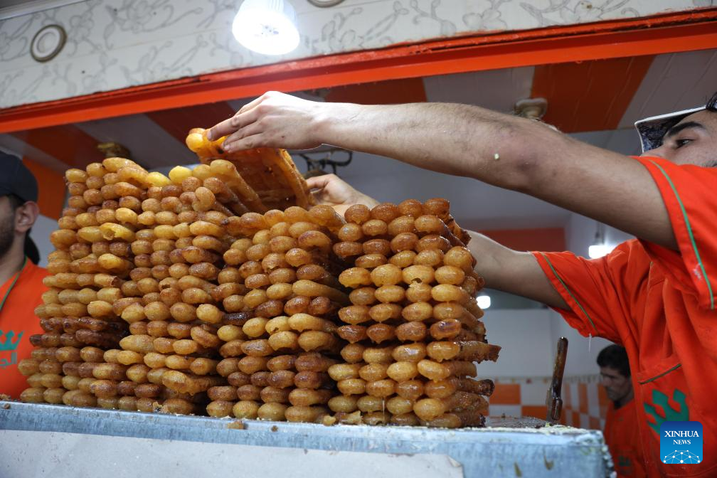 This photo taken on Feb. 24, 2026 shows various desserts at a dessert house during Ramadan in Boufarik, Algeria. (Xinhua)