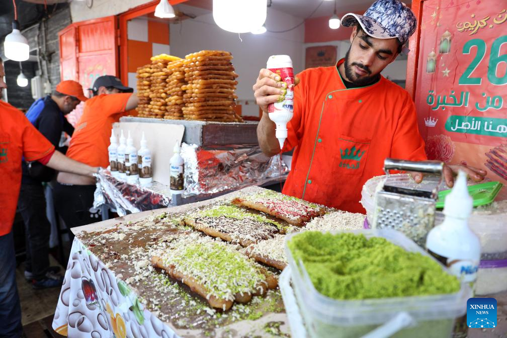 A man arranges dessert during Ramadan in Boufarik, Algeria, Feb. 24, 2026. (Xinhua)