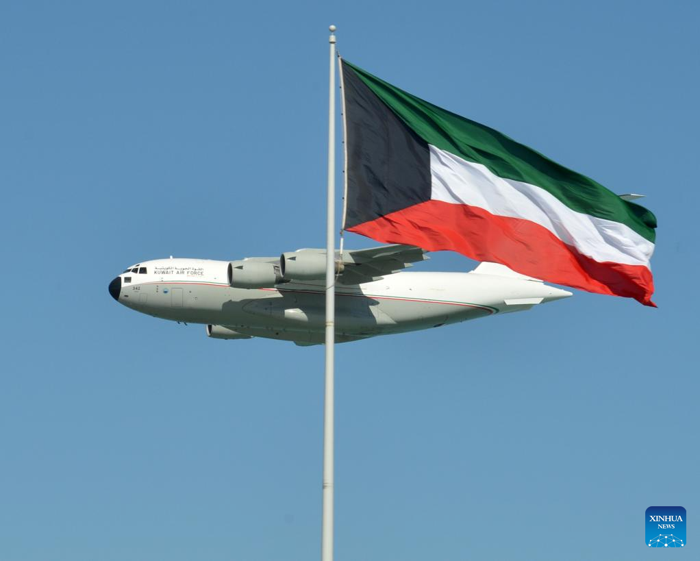 A Kuwait Air Force transport aircraft flies over Kuwait City in celebration of Kuwait's National Day and Liberation Day, in Kuwait, Feb. 25, 2026. (Photo by Asad/Xinhua)