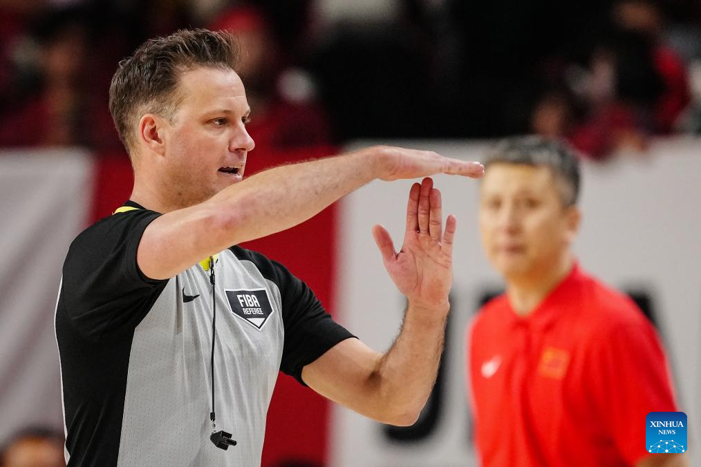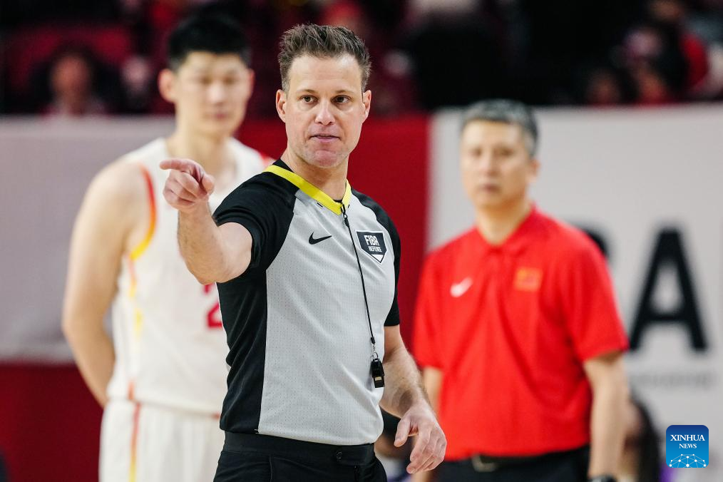 Referee Ryan Jones makes a call during the Group B match between China and Japan at the FIBA Basketball World Cup Asian Qualifiers in Okinawa, Japan, Feb. 26, 2026. (Xinhua/Jia Haocheng)