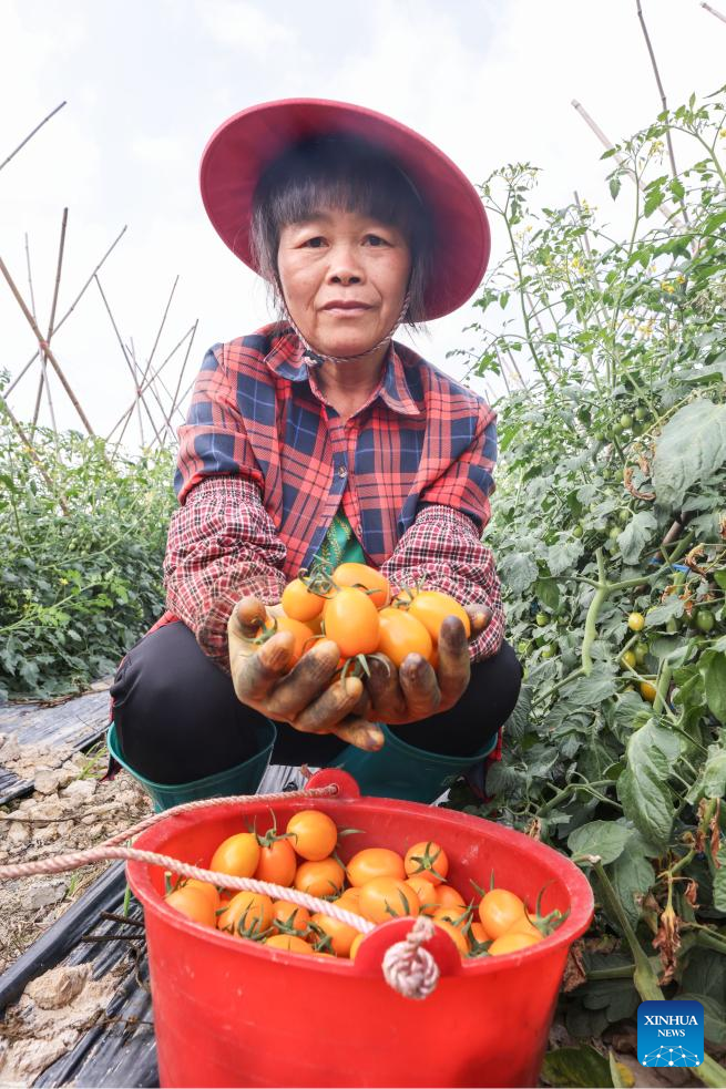 A farmer shows newly-harvested cherry tomatoes in Tanli Village of Ding'an County, south China's Hainan Province, Feb. 25, 2026. Cherry tomatoes here now entered harvest season. Relying on its natural advantages, the county has developed and expanded the cherry tomato industry by perfecting industrial chain, enriching varieties and integrating with tourism. (Xinhua/Zhang Liyun)