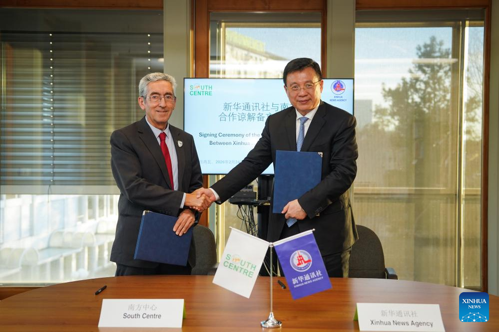 President of Xinhua News Agency Fu Hua meets with Carlos Correa, executive director of the South Centre, in Geneva, Switzerland, Feb. 24. 2026. The two sides signed a memorandum of understanding (MoU) during the meeting. (Xinhua/Peng Ziyang)