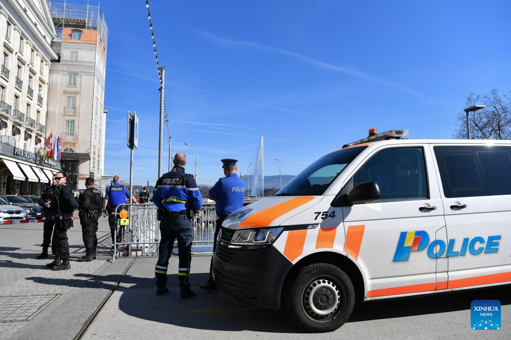 Police are seen in Geneva, Switzerland, Feb. 26, 2026. Ukrainian and U.S. delegations began talks in Geneva on Thursday as part of the efforts to end the years-long Ukraine-Russia conflict. (Xinhua/Lian Yi)