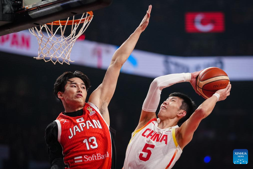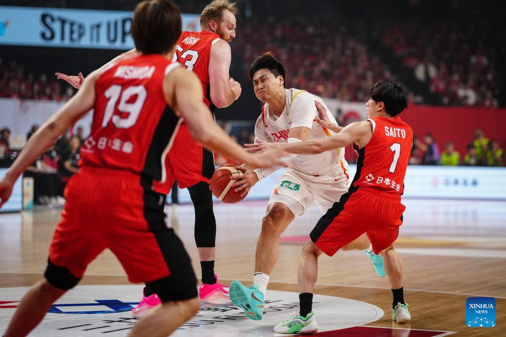 Zhao Rui (2nd R) of China breaks through during the Group B match between China and Japan at the FIBA Basketball World Cup Asian Qualifiers in Okinawa, Japan, Feb. 26, 2026. (Xinhua/Jia Haocheng)