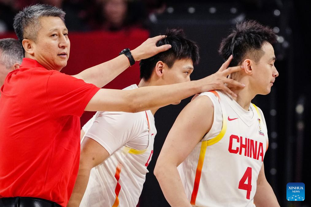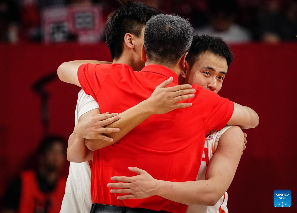 Zhao Jiwei (R) of China hugs head coach Guo Shiqiang (C) after the Group B match between China and Japan at the FIBA Basketball World Cup Asian Qualifiers in Okinawa, Japan, Feb. 26, 2026. (Xinhua/Jia Haocheng)