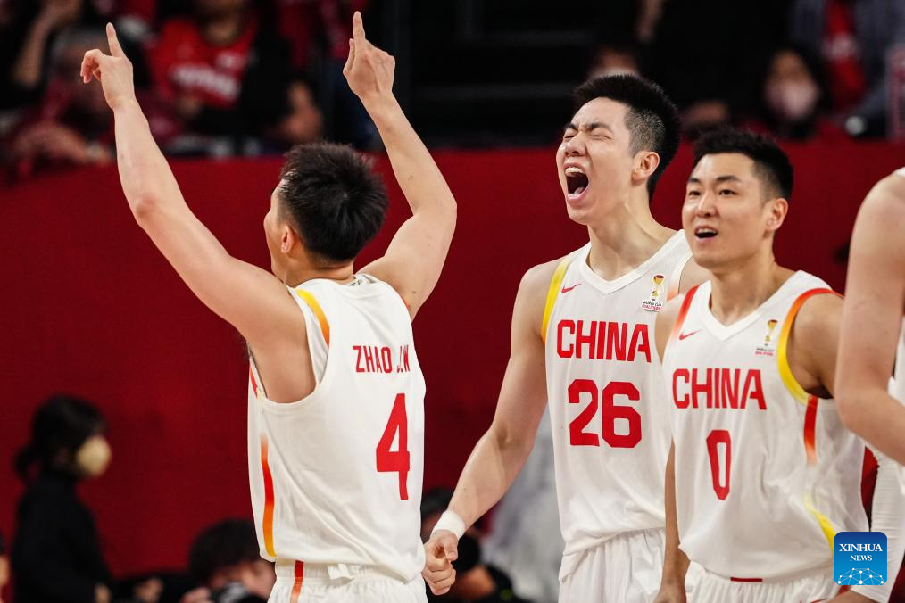 Zhao Jiwei (front) of China celebrates after the Group B match between China and Japan at the FIBA Basketball World Cup Asian Qualifiers in Okinawa, Japan, Feb. 26, 2026. (Xinhua/Jia Haocheng)