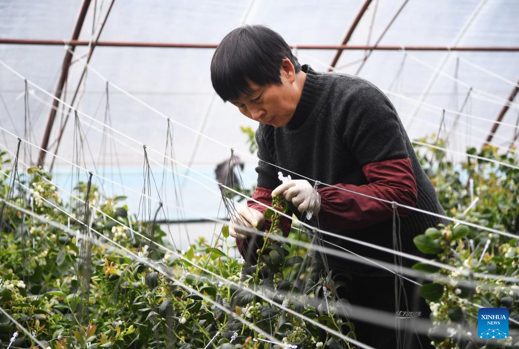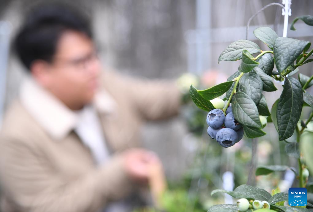 A worker checks the growth of blueberry plants at a greenhouse in Pinggu District of Beijing, capital of China, Feb. 26, 2026. As greenhouse blueberries ripen in Pinggu District of Beijing, local workers are boosting sales through live-streaming e-commerce and agri-tourism programs. (Xinhua/Ren Chao)