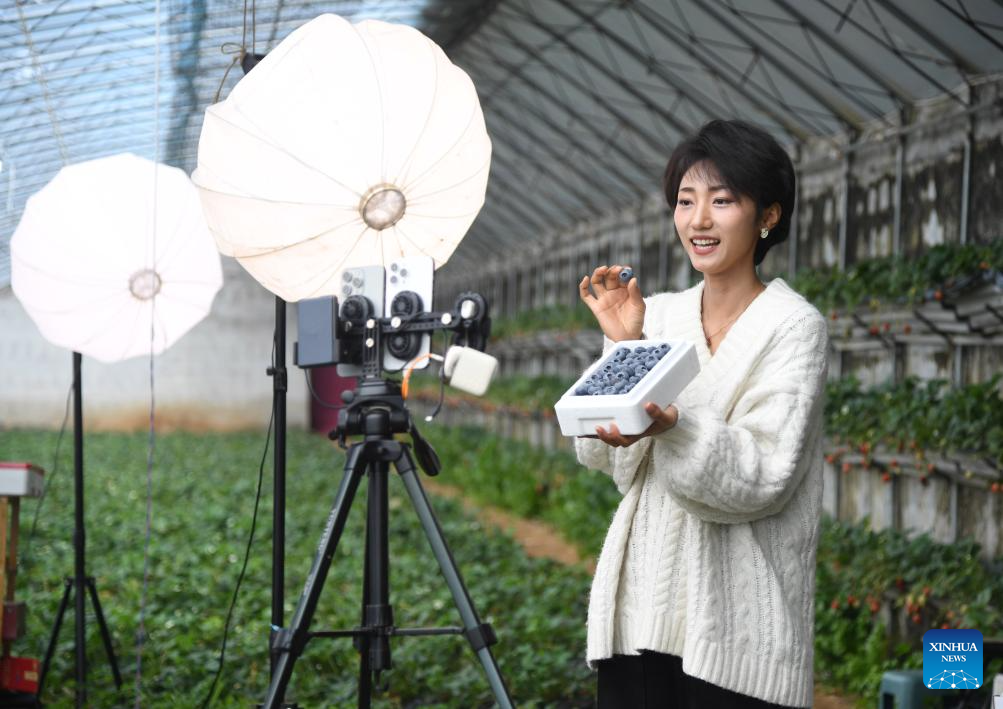 A woman promotes blueberries via live-streaming at a greenhouse in Pinggu District of Beijing, capital of China, Feb. 26, 2026. As greenhouse blueberries ripen in Pinggu District of Beijing, local workers are boosting sales through live-streaming e-commerce and agri-tourism programs. (Xinhua/Ren Chao)