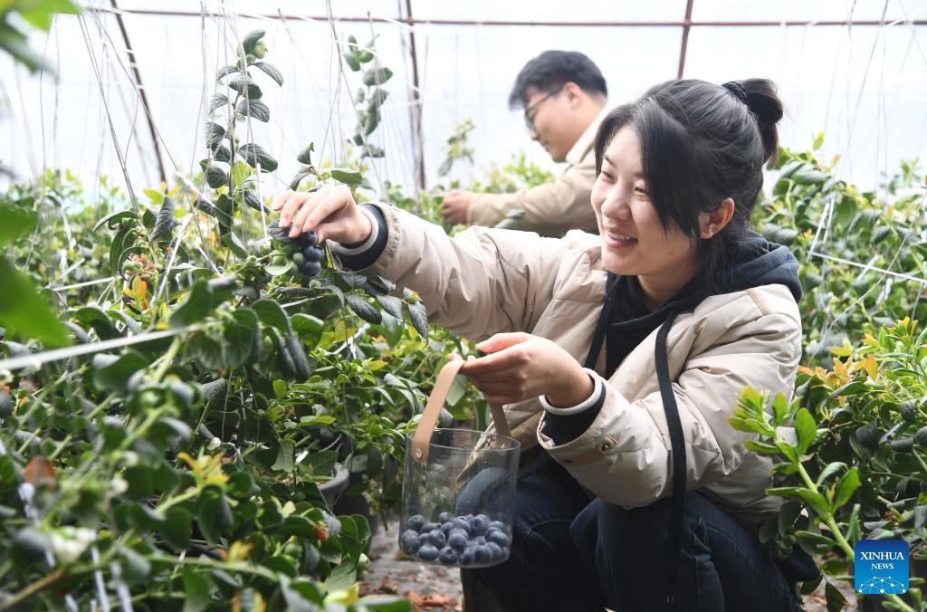 Citizens pick blueberries at a greenhouse in Pinggu District of Beijing, capital of China, Feb. 26, 2026. As greenhouse blueberries ripen in Pinggu District of Beijing, local workers are boosting sales through live-streaming e-commerce and agri-tourism programs. (Xinhua/Ren Chao)