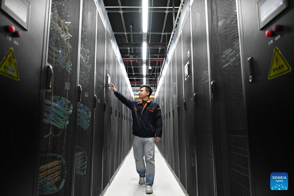 An engineer conducts an inspection of the intelligent computing servers at an intelligent computing center of China Telecom at the Beijing-Tianjin Industrial New City Gaocun Data Intelligence Innovation Park in north China's Tianjin, Feb. 26, 2026. The Beijing-Tianjin Industrial New City Gaocun Data Intelligence Innovation Park is a pivotal platform for fostering the digital economy in Tianjin's Wuqing District. The park boasts six high-level data centers in operation and is home to over 300 data-driven enterprises. It delivers efficient, low-latency, real-time computing services to support businesses across the Beijing-Tianjin-Hebei region in sectors including finance, digital creativity, rail transit, and healthcare. Its computing service capabilities maintain a leading position in the region. (Xinhua/Sun Fanyue)