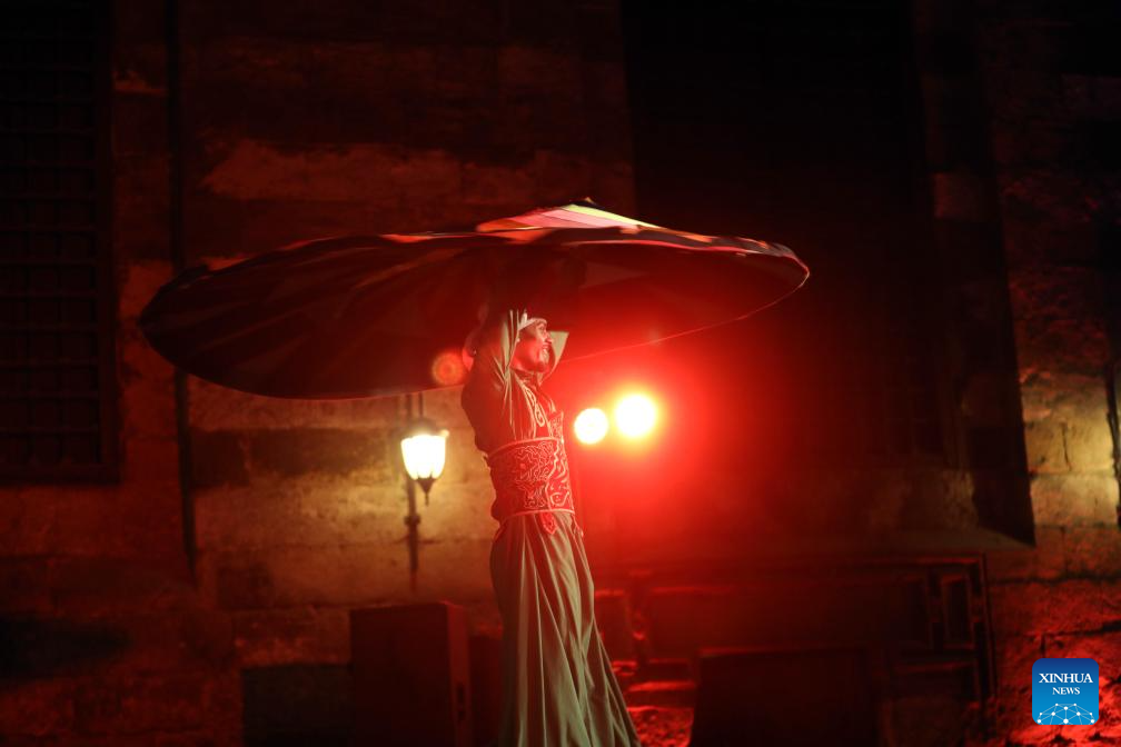 A dancer performs Tanoura, a traditional Egyptian folk dance, during the holy month of Ramadan at the Sultan Al-Ghuri complex in Cairo, Egypt, Feb. 25, 2026. (Xinhua/Ahmed Gomaa)