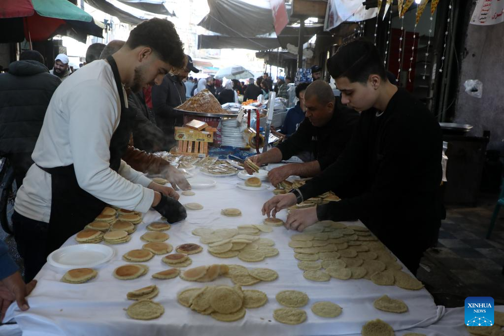 A Palestinian vendor makes traditional dessert at a market in the Gaza City during the holy month of Ramadan, Feb. 24, 2026. (Photo by Rizek Abdeljawad/Xinhua)