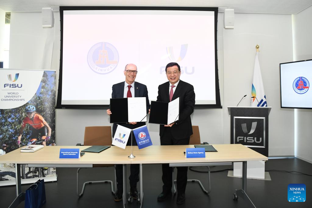 President of Xinhua News Agency Fu Hua poses for photos with Leonz Eder, president of the International University Sports Federation (FISU), after the signing of a memorandum of understanding (MoU) on news cooperation in Lausanne, Switzerland, Feb. 25, 2026. Xinhua News Agency and the FISU on Wednesday signed a MoU on news cooperation in Lausanne, Switzerland. (Xinhua/Lian Yi)