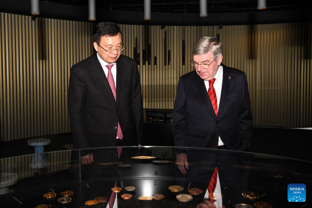 President of Xinhua News Agency Fu Hua and International Olympic Committee (IOC) Honorary President for Life Thomas Bach view Olympic medals at the Olympic Museum in Lausanne, Switzerland, Feb. 25, 2026. Fu met with Bach here on Wednesday. (Xinhua/Lian Yi)