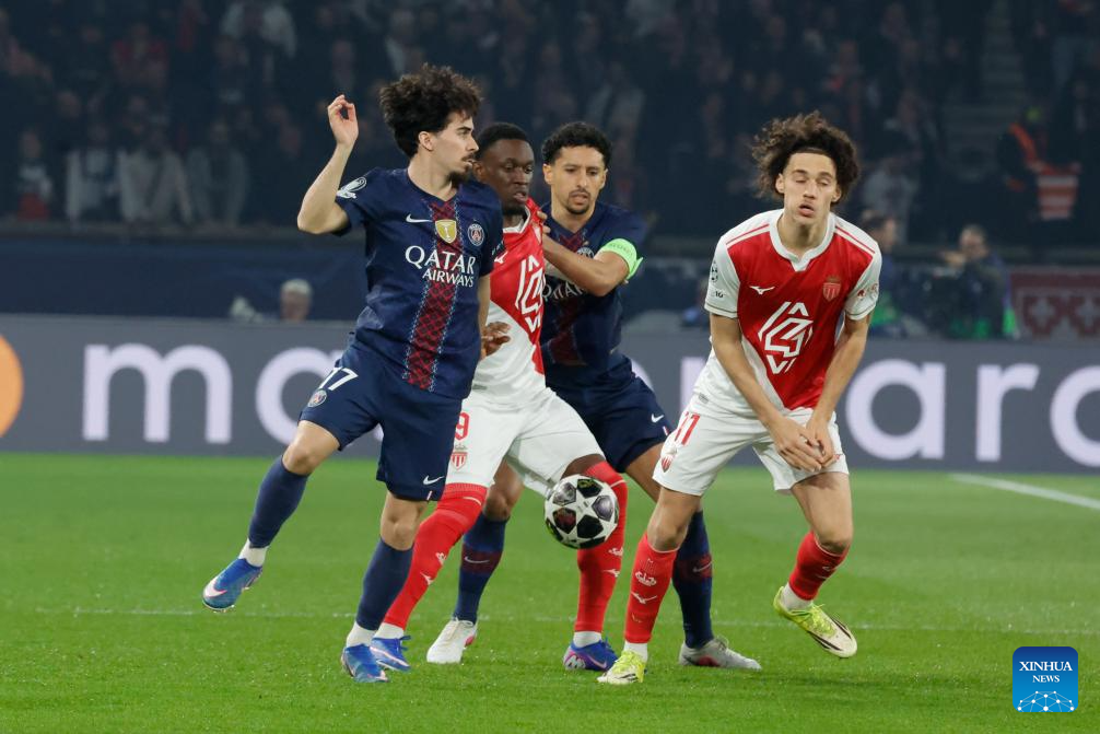 PSG's Vitinha (1st L) and Marquinhos (2nd R) vie with Monaco's Folarin Balogun (2nd L) and Maghnes Akliouche during the UEFA Champions League play-off second leg football match between Paris Saint-Germain (PSG) and AS Monaco in Paris, France, Feb. 25, 2026. (Photo by Henri Szwarc/Xinhua)