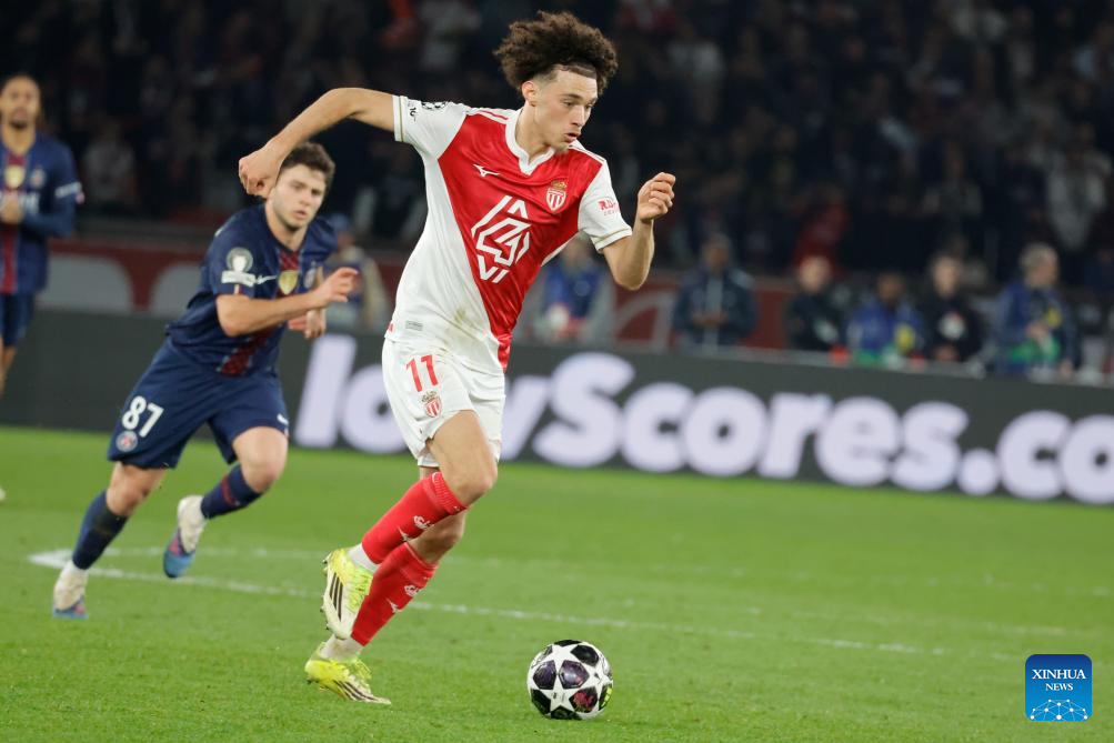 Monaco's Maghnes Akliouche breaks through during the UEFA Champions League play-off second leg football match between Paris Saint-Germain (PSG) and AS Monaco in Paris, France, Feb. 25, 2026. (Photo by Henri Szwarc/Xinhua)