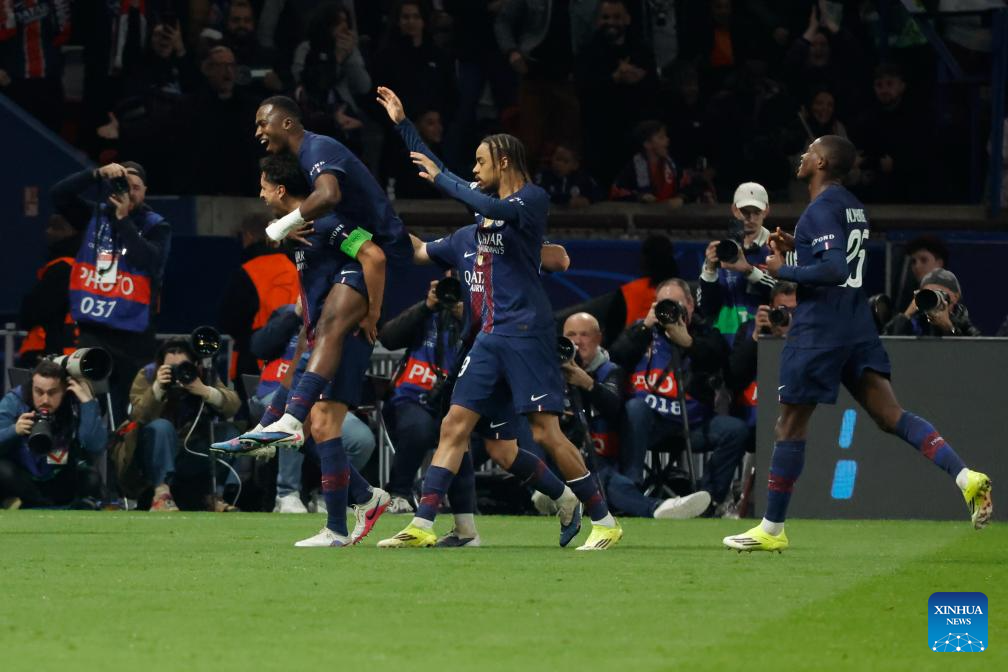 PSG's players celebrate after scoring during the UEFA Champions League play-off second leg football match between Paris Saint-Germain (PSG) and AS Monaco in Paris, France, Feb. 25, 2026. (Photo by Henri Szwarc/Xinhua)