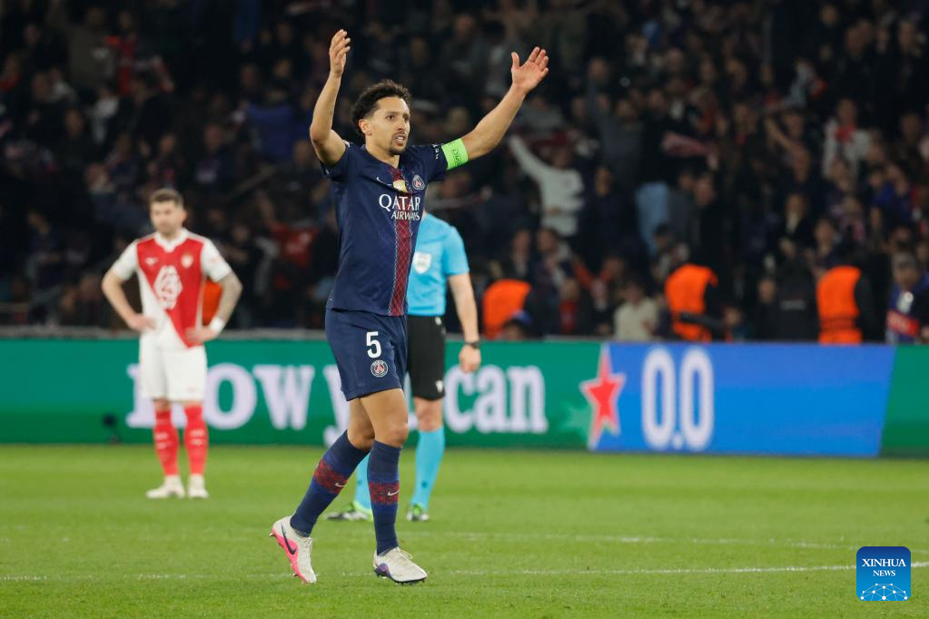 PSG's Marquinhos celebrates after scoring during the UEFA Champions League play-off second leg football match between Paris Saint-Germain (PSG) and AS Monaco in Paris, France, Feb. 25, 2026. (Photo by Henri Szwarc/Xinhua)