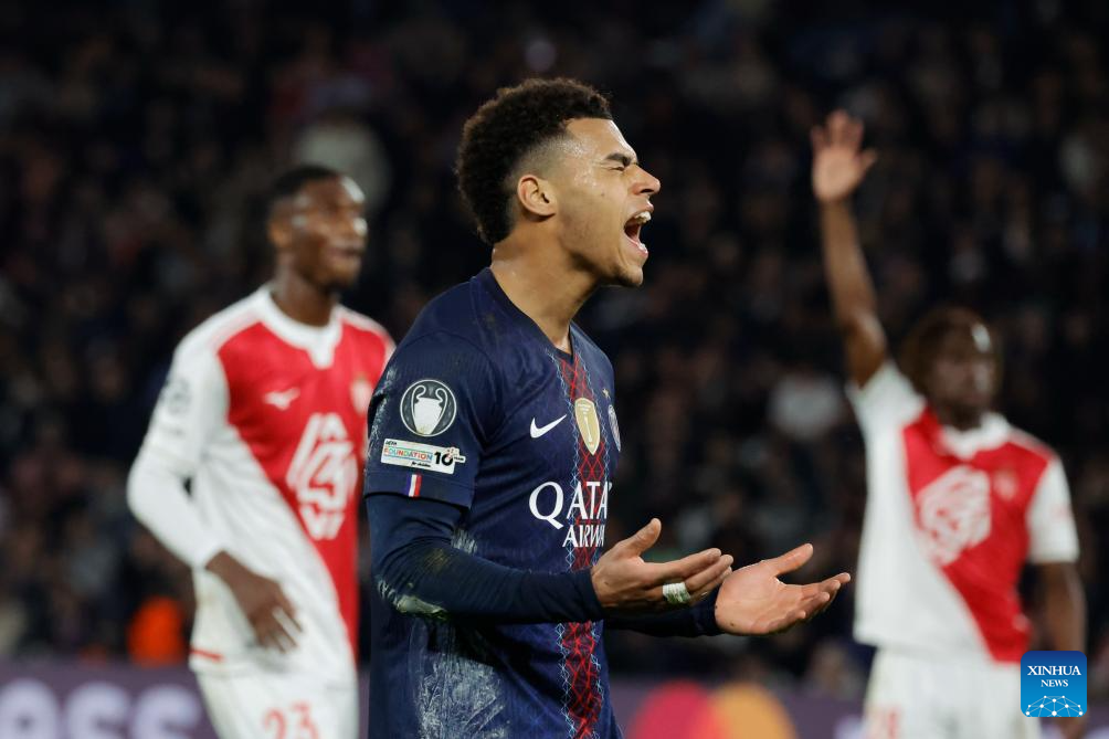 PSG's Desire Doue reacts after missing a goal during the UEFA Champions League play-off second leg football match between Paris Saint-Germain (PSG) and AS Monaco in Paris, France, Feb. 25, 2026. (Photo by Henri Szwarc/Xinhua)