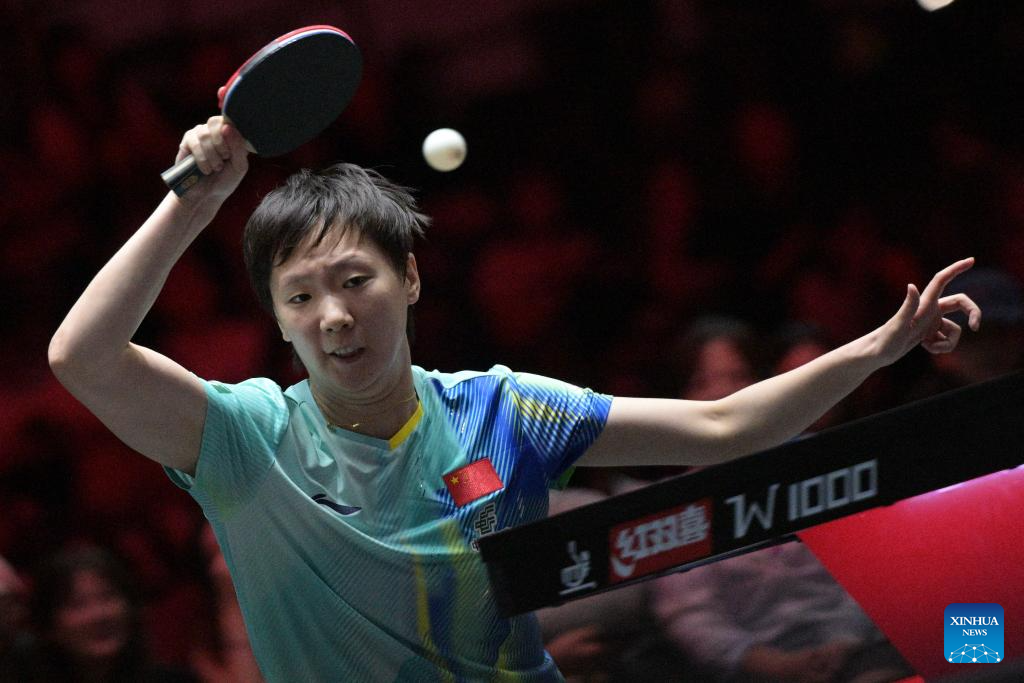Wang Manyu hits a return during the women's singles round of 16 match between Wang Manyu of China and Shin Yubin of South Korea at the World Table Tennis (WTT) Singapore Smash 2026 in Singapore, on Feb. 26, 2026. (Photo by Then Chih Wey/Xinhua)
