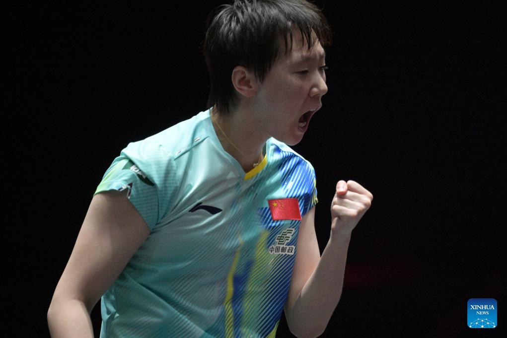 Wang Manyu reacts during the women's singles round of 16 match between Wang Manyu of China and Shin Yubin of South Korea at the World Table Tennis (WTT) Singapore Smash 2026 in Singapore, on Feb. 26, 2026. (Photo by Then Chih Wey/Xinhua)