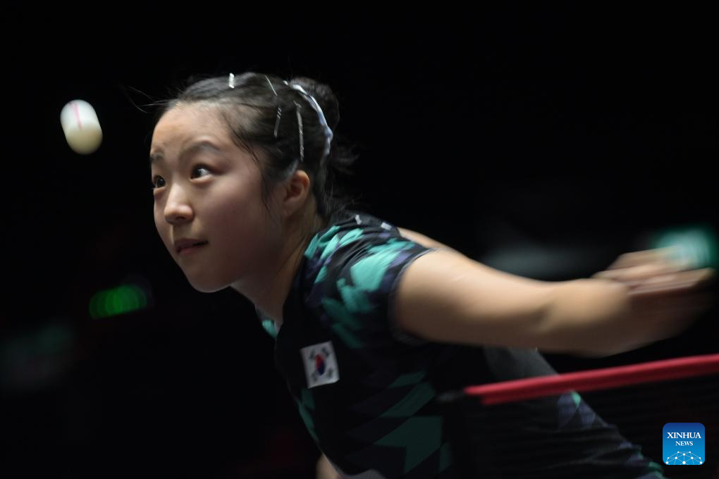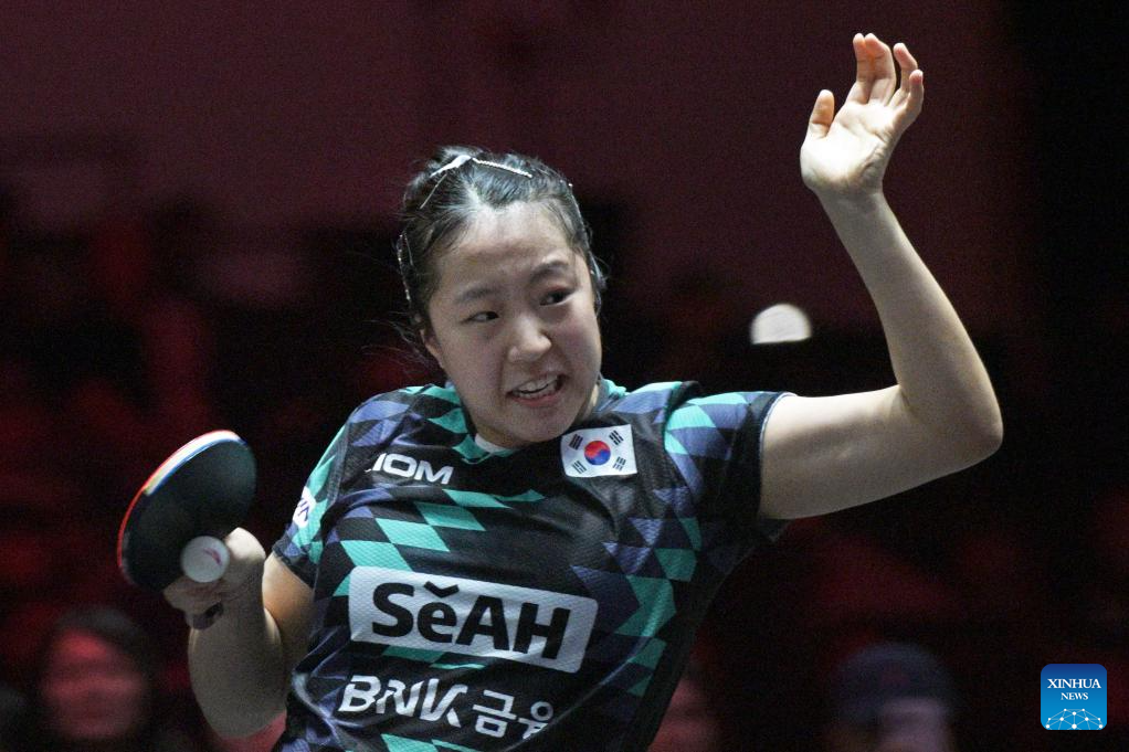 Shin Yubin hits a return during the women's singles round of 16 match between Wang Manyu of China and Shin Yubin of South Korea at the World Table Tennis (WTT) Singapore Smash 2026 in Singapore, on Feb. 26, 2026. (Photo by Then Chih Wey/Xinhua)