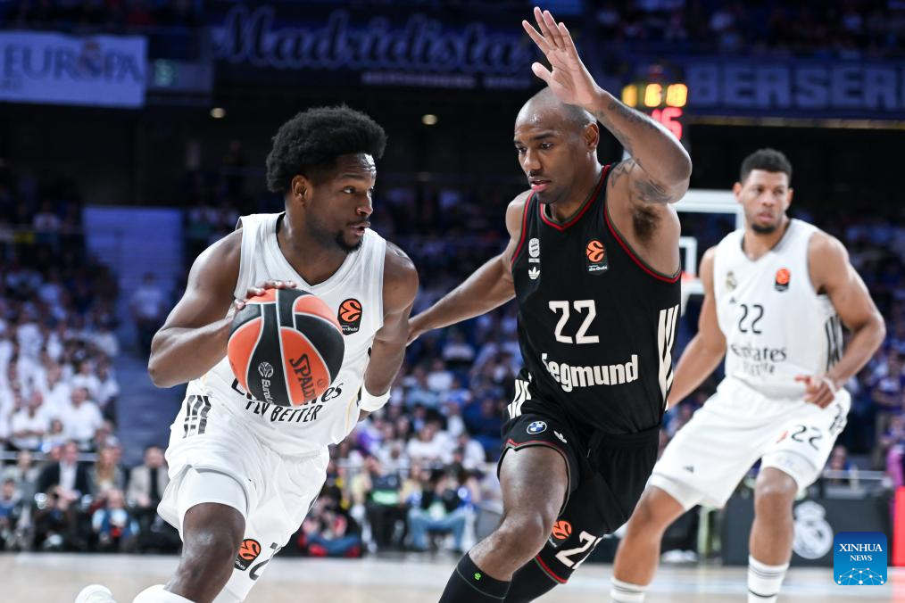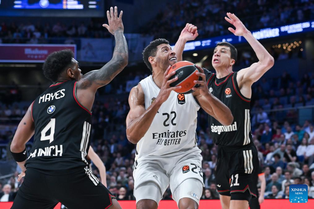 Real Madrid's Andres Feliz (L) vies with Bayern Munich's Isiaha Mike (C) during the Euroleague basketball match between Real Madrid and Bayern Munich in Madrid, Spain, on Feb. 26, 2026. (Photo by Gustavo Valiente/Xinhua)