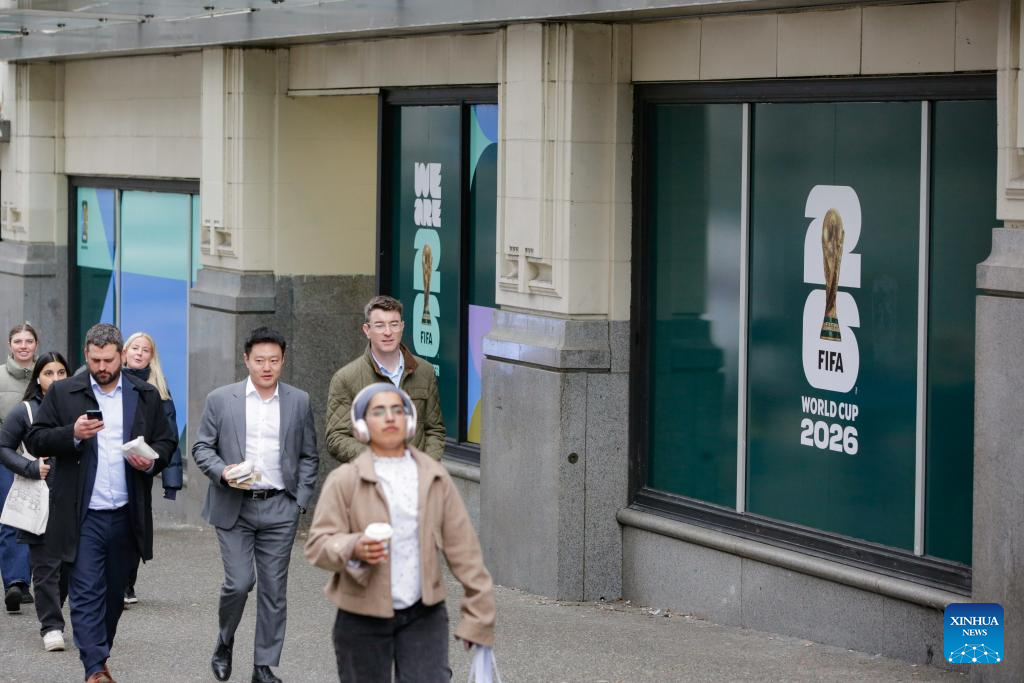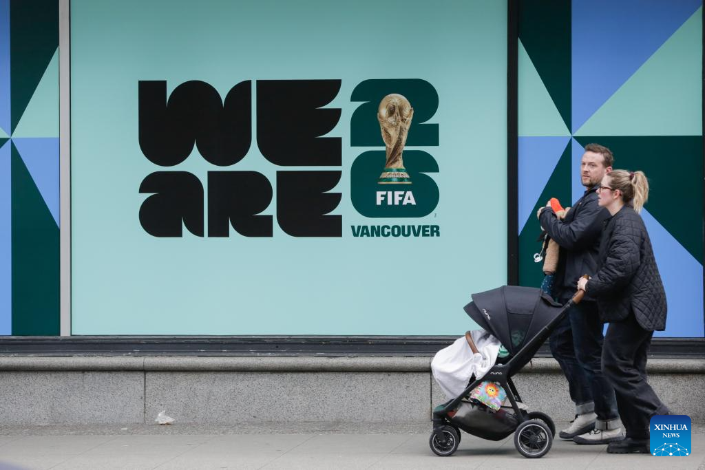 People walk past signage for the 2026 FIFA World Cup displayed outside a building in Vancouver, Canada, on Feb. 26, 2026. Installation of event-related signage and city-dressing elements using official tournament branding standards has begun across downtown Vancouver this month in preparation for the 2026 FIFA World Cup and will continue to expand in the coming months, according to the City of Vancouver. (Photo by Liang Sen/Xinhua)
