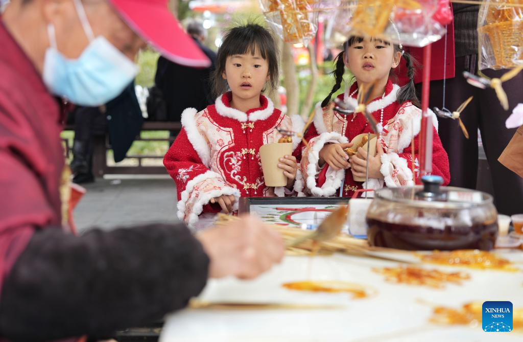 Children watch a syrup art craftsman working at a temple fair at Wuhou Shrine in Chengdu, southwest China's Sichuan Province, Feb. 27, 2026. The temple fair is held here to mark the ongoing Spring Festival, or the Chinese New Year, which will end on the 15th day of the first lunar month. (Xinhua/Liu Kun)