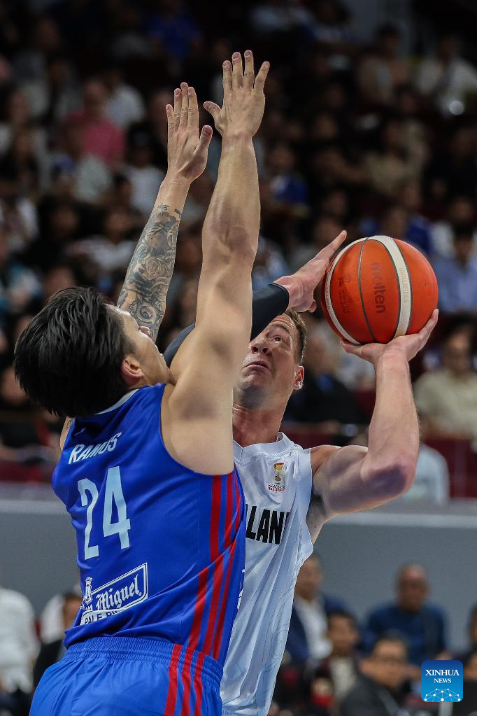 Sam Mennenga (R) of New Zealand competes against Dwight Ramos (L) of the Philippines during the group A match between New Zealand and the Philippines at the FIBA World Cup Asian Qualifiers in Pasay City, the Philippines, on Feb. 26, 2026. (Xinhua/Rouelle Umali)