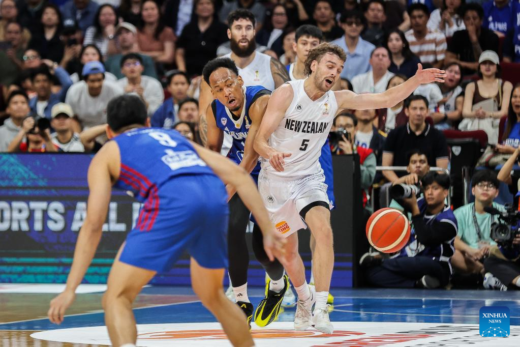 Taylor Britt (R) of New Zealand competes during the group A match between New Zealand and the Philippines at the FIBA World Cup Asian Qualifiers in Pasay City, the Philippines, on Feb. 26, 2026. (Xinhua/Rouelle Umali)