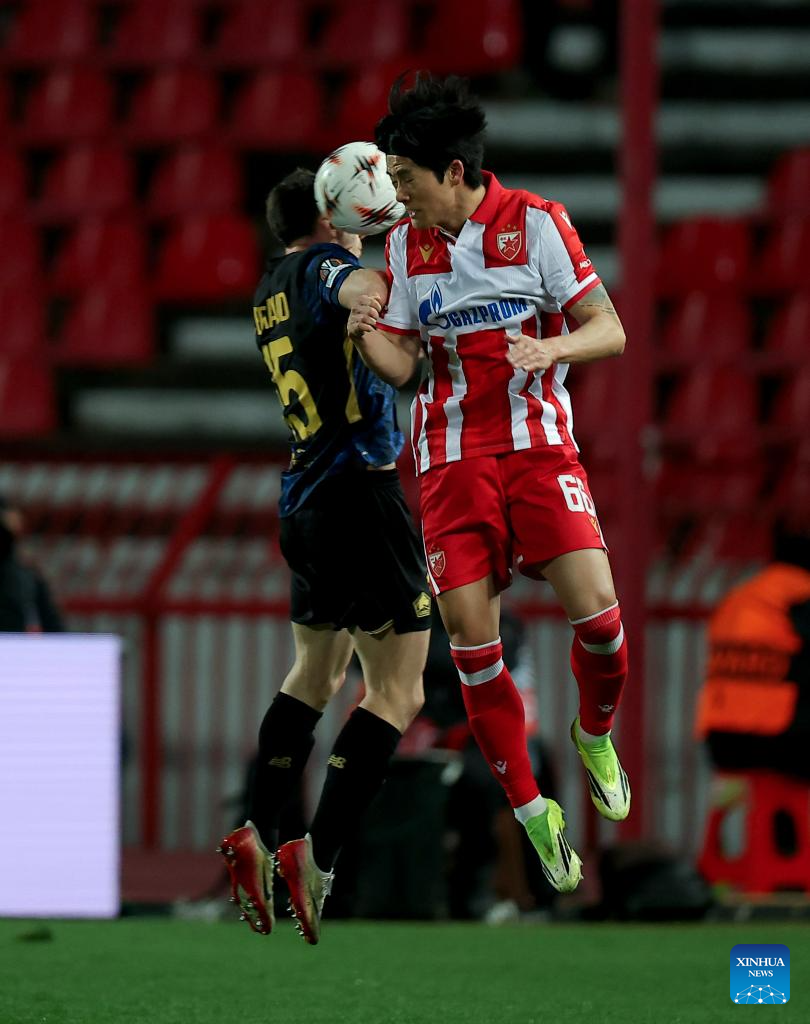 Crvena Zvezda's Seol Youngwoo (R) vies with Lille's Romain Perraud during the UEFA Europa League play-offs 2nd leg match between Crvena Zvezda and Lille in Belgrade, Serbia, on Feb. 26, 2026. (Photo by Predrag Milosavljevic/Xinhua)