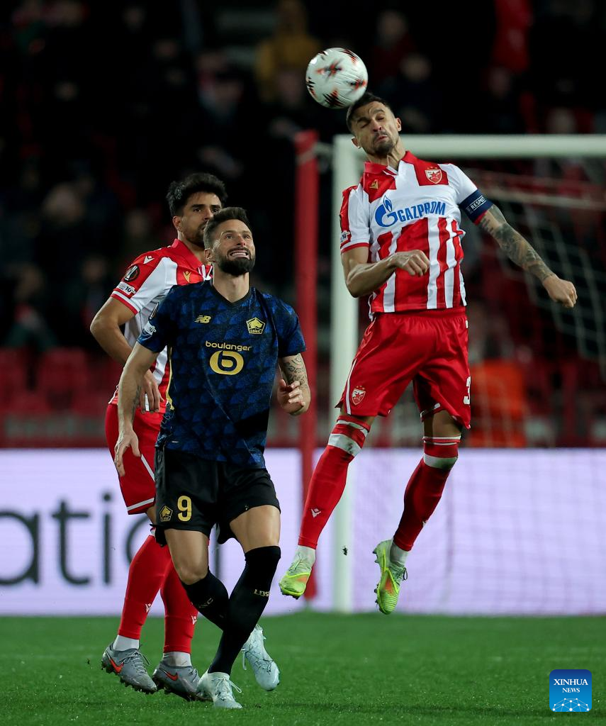 Crvena Zvezda's Rade Krunic (R) vies with Lille's Olivier Giroud (C) during the UEFA Europa League play-offs 2nd leg match between Crvena Zvezda and Lille in Belgrade, Serbia, on Feb. 26, 2026. (Photo by Predrag Milosavljevic/Xinhua)