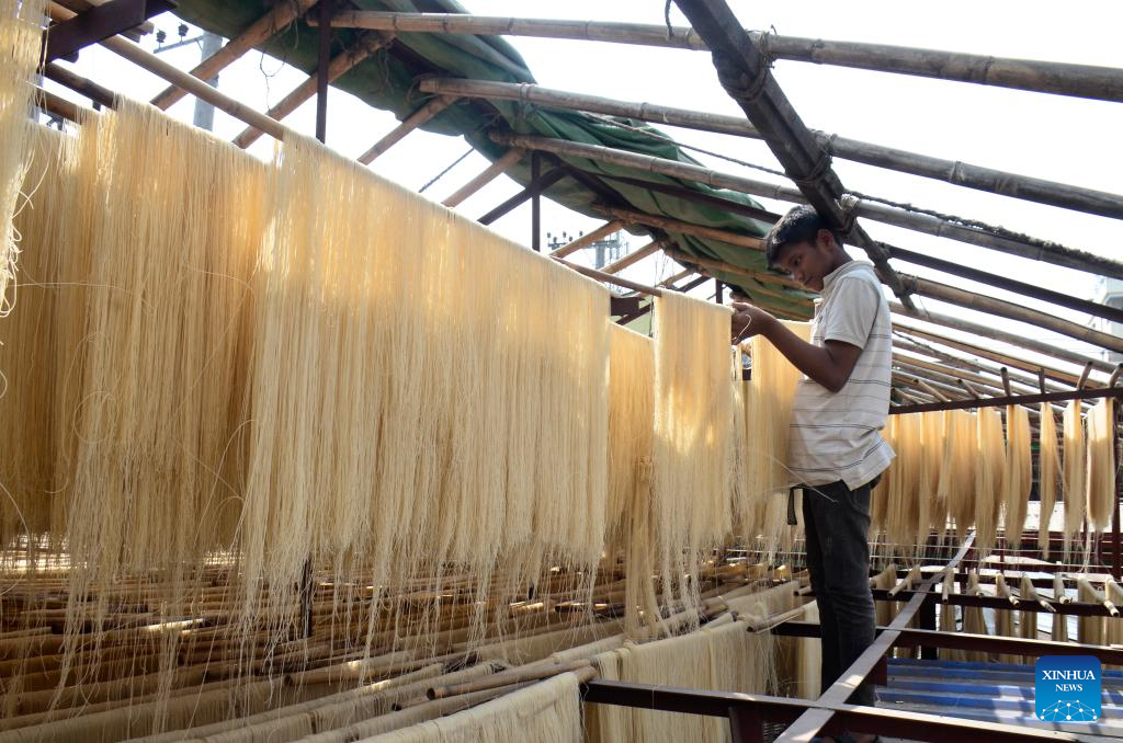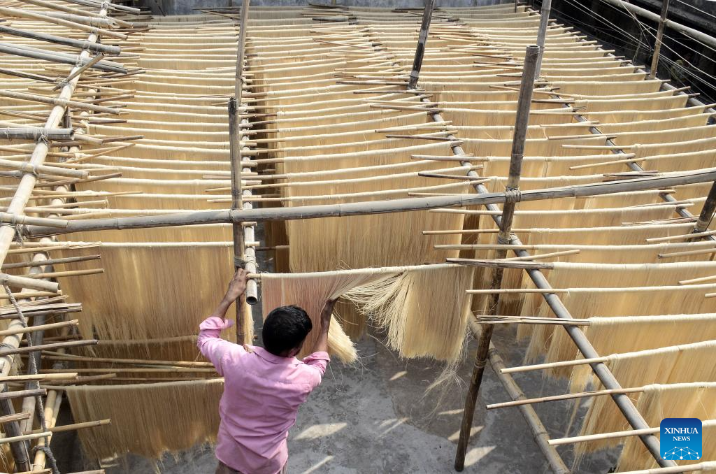 A worker dries vermicelli noodles at a factory in Chittagong, Bangladesh, Feb. 26, 2026. (Photo by Habibur Rahman/Xinhua)