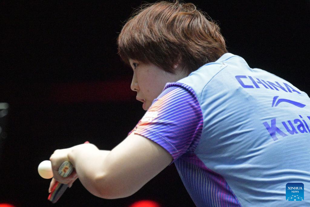 Kuai Man hits a return during the women's singles round of 16 match between Kuai Man of China and Hayata Hina of Japan at the World Table Tennis (WTT) Singapore Smash 2026 in Singapore on Feb. 27, 2026. (Photo by Then Chih Wey/Xinhua)