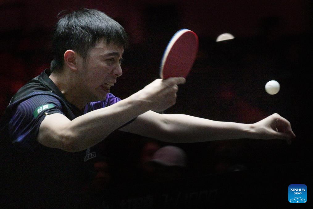 Chen Yuanyu hits a return during the men's singles round of 16 match between Chen Yuanyu of China and Hugo Calderano of Brazil at the World Table Tennis (WTT) Singapore Smash 2026 in Singapore on Feb. 27, 2026. (Photo by Then Chih Wey/Xinhua)