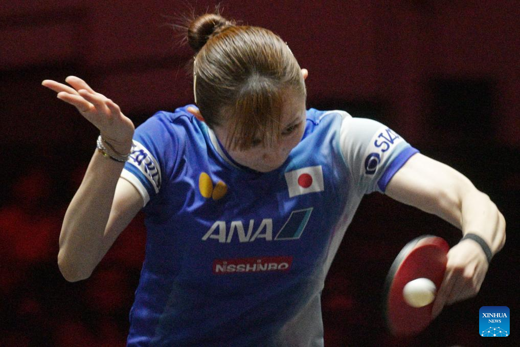 Hayata Hina hits a return during the women's singles round of 16 match between Kuai Man of China and Hayata Hina of Japan at the World Table Tennis (WTT) Singapore Smash 2026 in Singapore on Feb. 27, 2026. (Photo by Then Chih Wey/Xinhua)