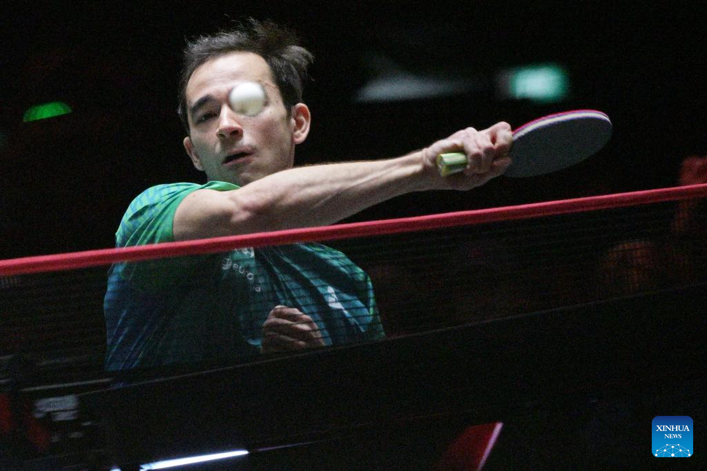 Hugo Calderano hits a return during the men's singles round of 16 match between Chen Yuanyu of China and Hugo Calderano of Brazil at the World Table Tennis (WTT) Singapore Smash 2026 in Singapore on Feb. 27, 2026. (Photo by Then Chih Wey/Xinhua)