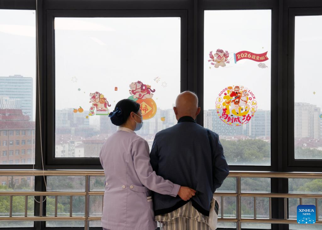 A nursing assistant helps an inpatient walk at a hospital in Shanghai, east China, Feb. 26, 2026.(Xinhua/Liu Ying)