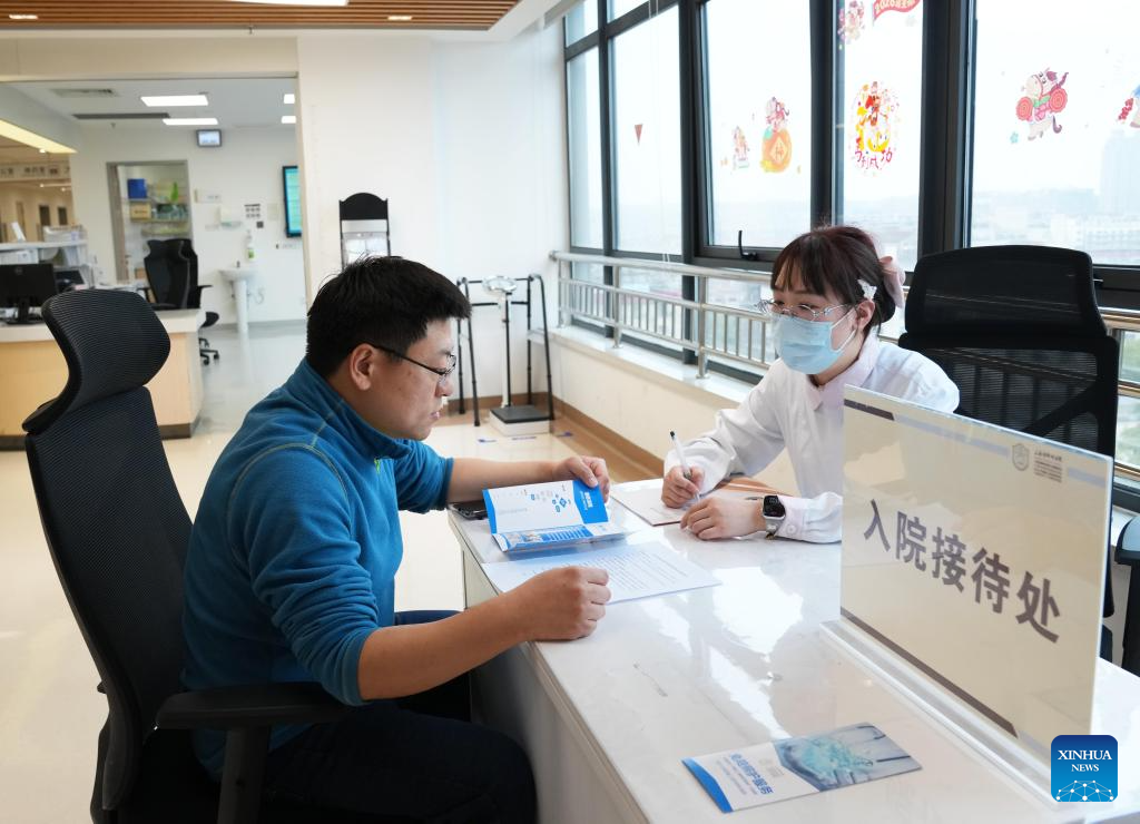 A family member of an inpatient learns about the "companion-free" care services at a hospital in Shanghai, east China, Feb. 26, 2026.(Xinhua/Liu Ying)