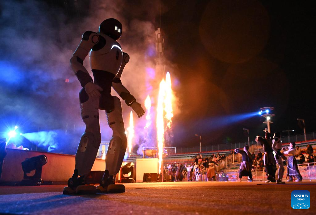 A humanoid robot performs during a myth-themed live-action show at a scenic area in Qingdao, east China's Shandong Province, on Feb. 26, 2026. (Xinhua/Li Ziheng)
