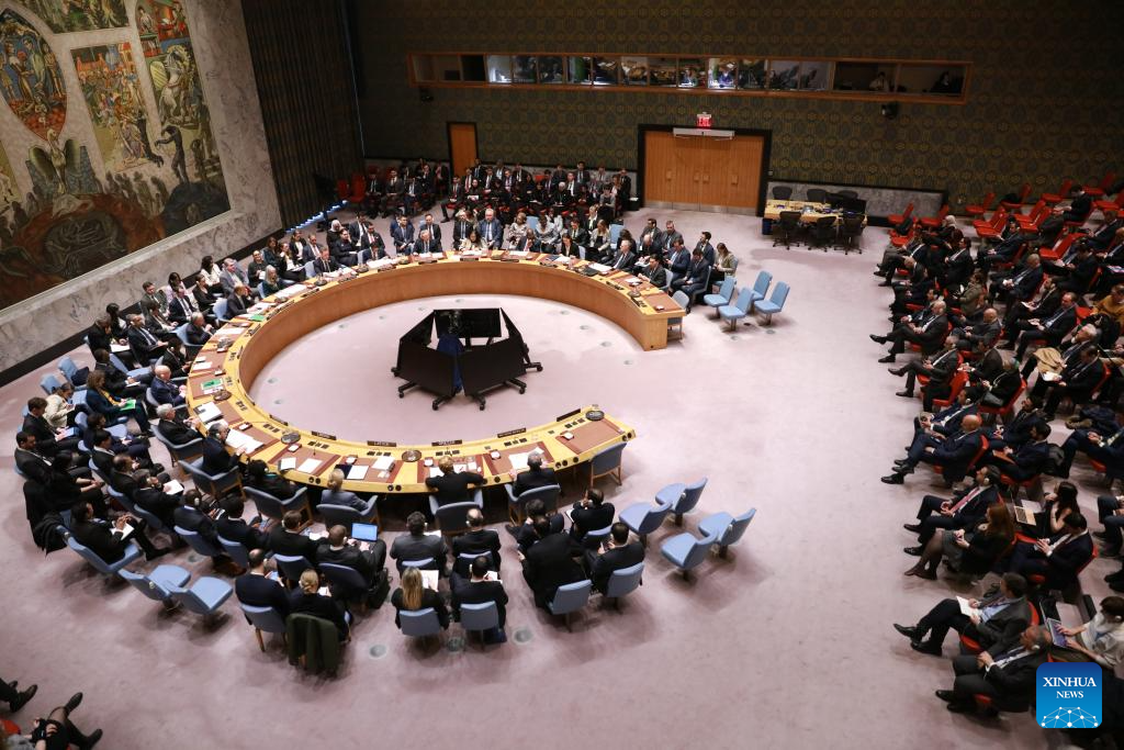 The United Nations (UN) Security Council holds an emergency meeting regarding the U.S.-Israeli attack on Iran at the UN headquarters in New York, Feb. 28, 2026. UN Secretary-General Antonio Guterres on Saturday condemned the military escalation in the Middle East, saying that the use of force by the United States and Israel against Iran, and the subsequent retaliation by Iran across the region, undermine international peace and security. (Xinhua/Xie E)