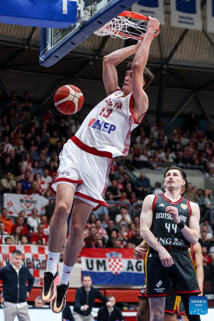 Michael Ruzic (L) of Croatia dunks during the first round group E match between Croatia and Germany at the FIBA Basketball World Cup 2027 European Qualifiers in Zagreb, Croatia, on Feb. 27, 2026. (Igor Kralj/PIXSELL via Xinhua)