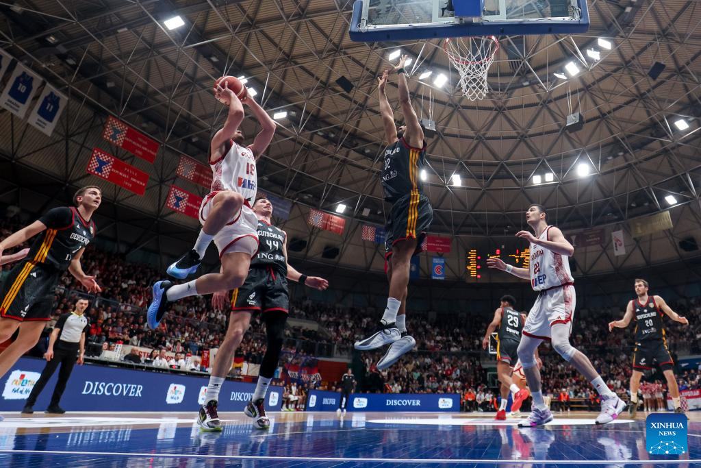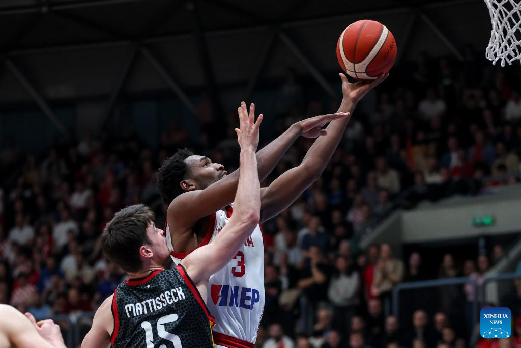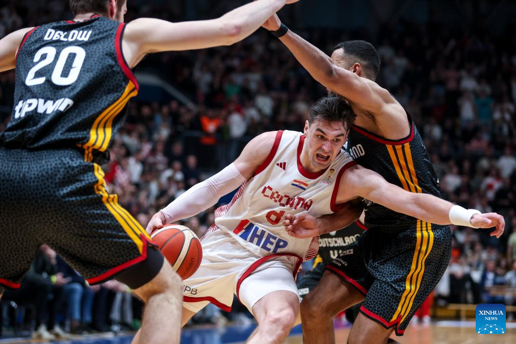 Johannes Thiemann (C) of Germany drives to the basket against Michael Ruzic (2nd R) of Croatia during the first round group E match between Croatia and Germany at the FIBA Basketball World Cup 2027 European Qualifiers in Zagreb, Croatia, on Feb. 27, 2026. (Igor Kralj/PIXSELL via Xinhua)