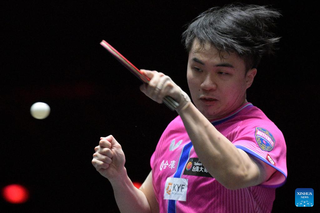 Lin Yun-Ju hits a return during the men's singles quarterfinal between Lin Yun-Ju of Chinese Taipei and Patrick Franziska of Germany at the World Table Tennis (WTT) Singapore Smash 2026 in Singapore on Feb. 28, 2026. (Photo by Then Chih Wey/Xinhua)