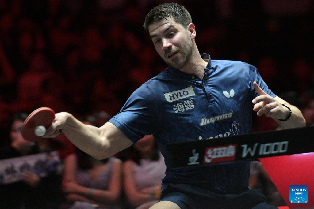 Patrick Franziska hits a return during the men's singles quarterfinal between Lin Yun-Ju of Chinese Taipei and Patrick Franziska of Germany at the World Table Tennis (WTT) Singapore Smash 2026 in Singapore on Feb. 28, 2026. (Photo by Then Chih Wey/Xinhua)
