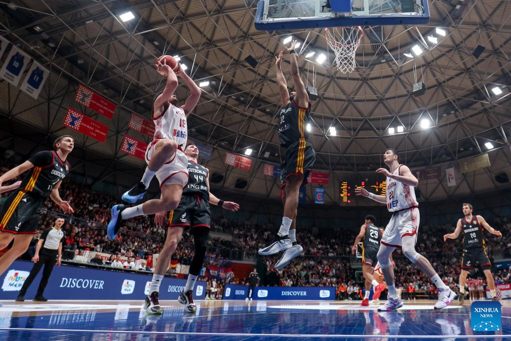 Roko Badzim (2nd L) of Croatia drives to the basket during the first round group E match between Croatia and Germany at the FIBA Basketball World Cup 2027 European Qualifiers in Zagreb, Croatia, on Feb. 27, 2026. (Igor Kralj/PIXSELL via Xinhua)