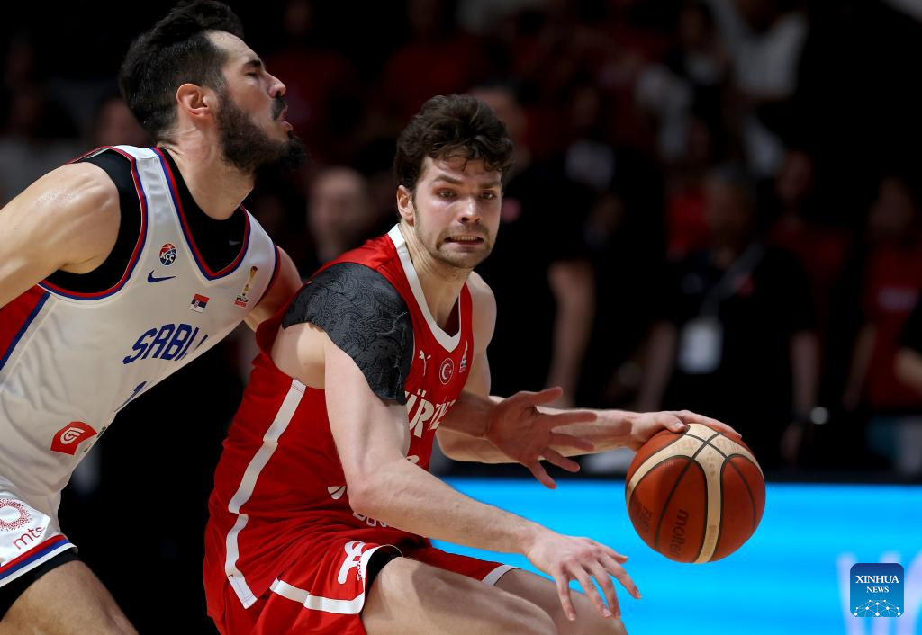 Türkiye's Tarik Biberovic (R) vies with Serbia's Nikola Kalinic during the first round group C match between Serbia and Türkiye at the FIBA Basketball World Cup 2027 European Qualifiers in Belgrade, Serbia, on Feb. 27, 2026. (Photo by Predrag Milosavljevic/Xinhua)