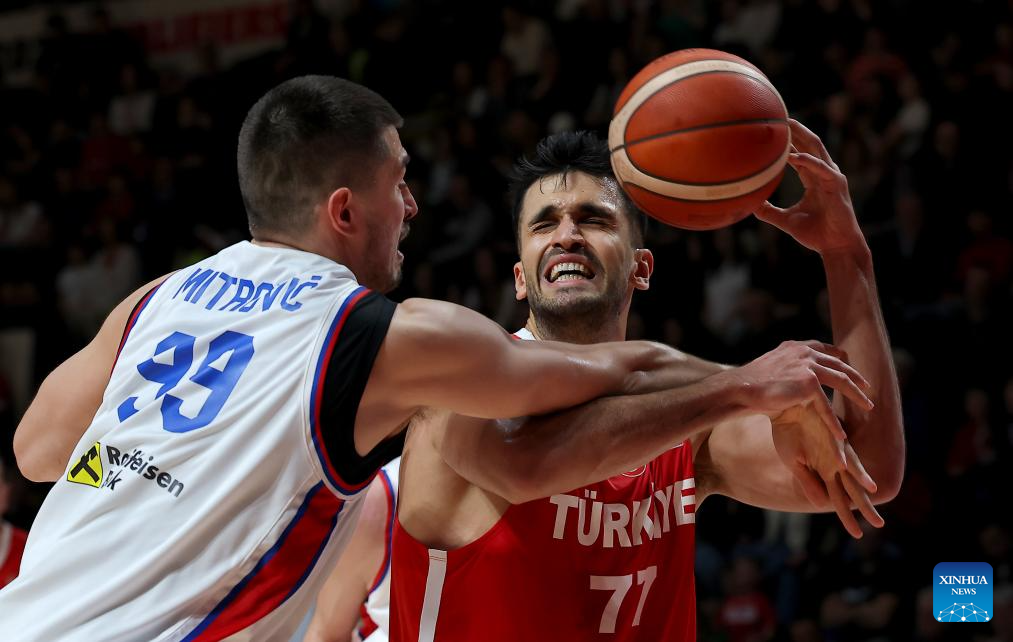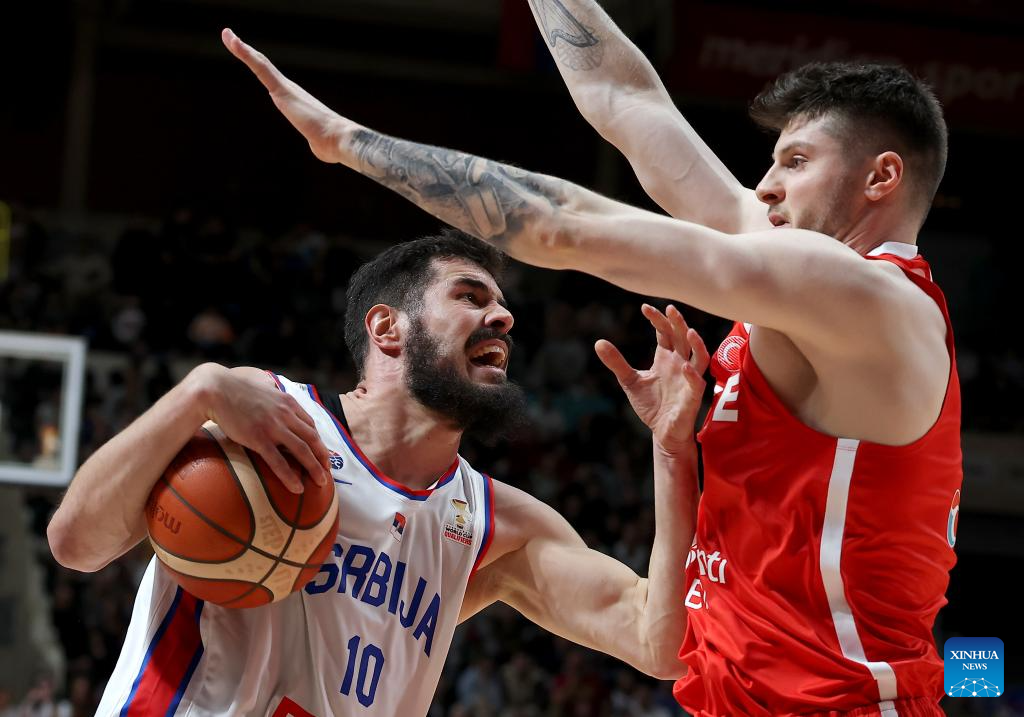 Serbia's Nikola Kalinic (L) vies with Türkiye's Metecan Birsen during the first round group C match between Serbia and Türkiye at the FIBA Basketball World Cup 2027 European Qualifiers in Belgrade, Serbia, on Feb. 27, 2026. (Photo by Predrag Milosavljevic/Xinhua)