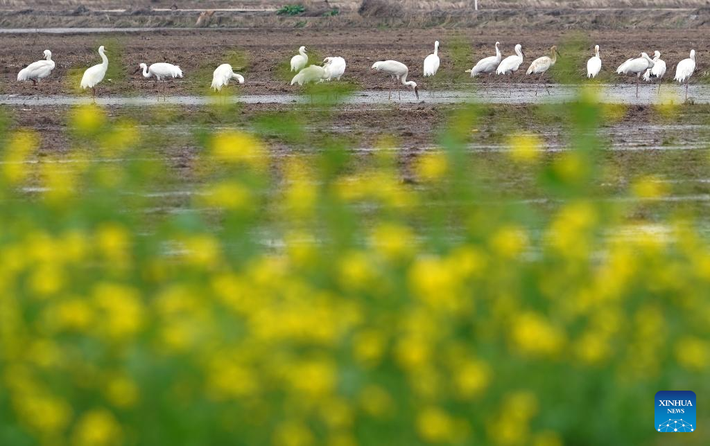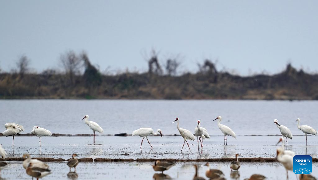 White cranes and other migratory birds are pictured at a wetland reserve in Yugan County of Shangrao, east China's Jiangxi Province, Feb. 27, 2026. (Xinhua/Wan Xiang)